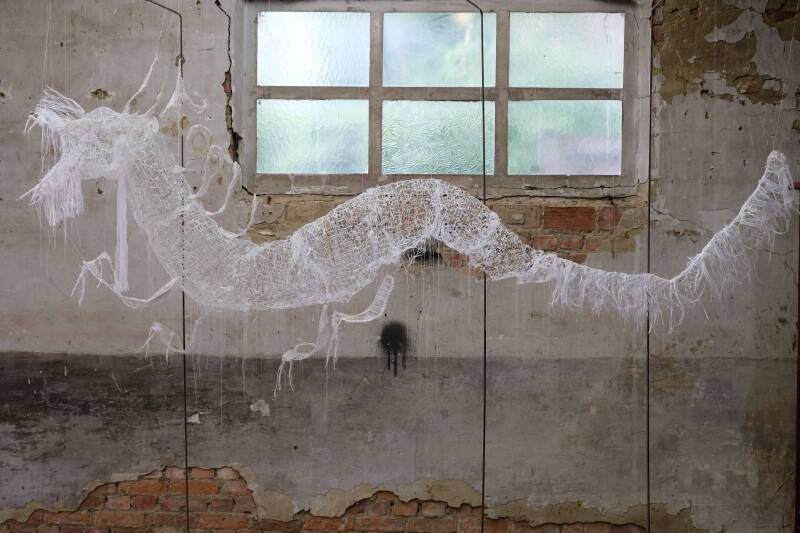 DRAGON - thread, wire, steel, granite stone 200 x 180 x 35 cm.